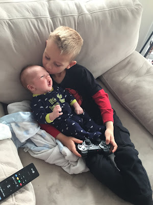 I asked Cohen to hold Laken for a moment while he was playing a video game. He's already able to multi-task!